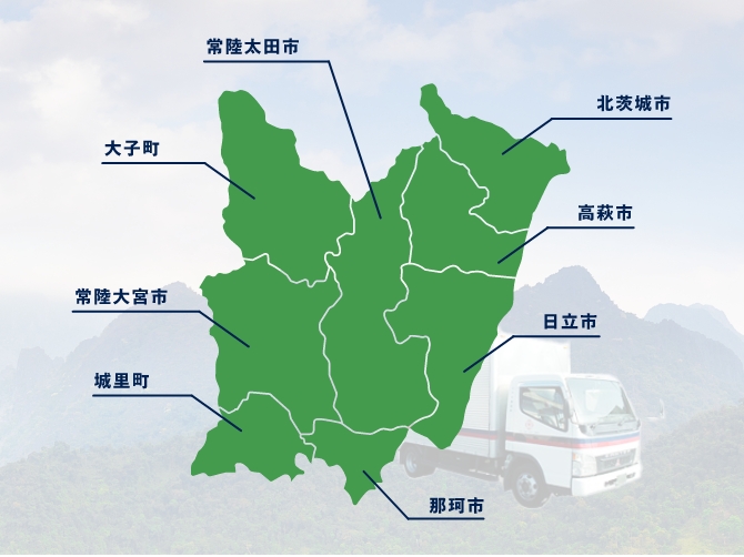 茨城県北部エリア(大子町、常陸大宮市、常陸太田市、那珂市、北茨城市、高萩市、日立市、ひたちなか市)にて、小荷物の配送を行っております。創業100年の経験を生かし、茨城でがんばる皆様を応援しています。配送エリア内でのお荷物の配送がございましたら、お気軽にお問い合わせください。